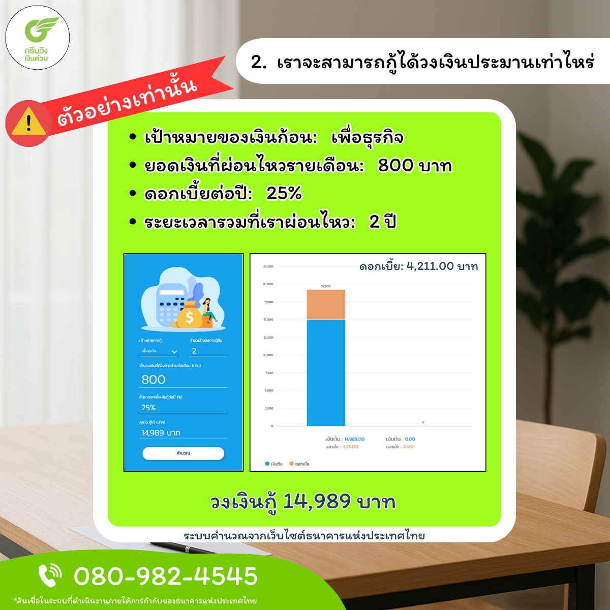 - ระบบจะคำนวณยอดเงินก้อนที่เราจะสามารถกู้ได้: ( 14,989 บาท )
